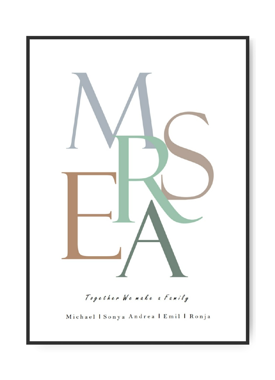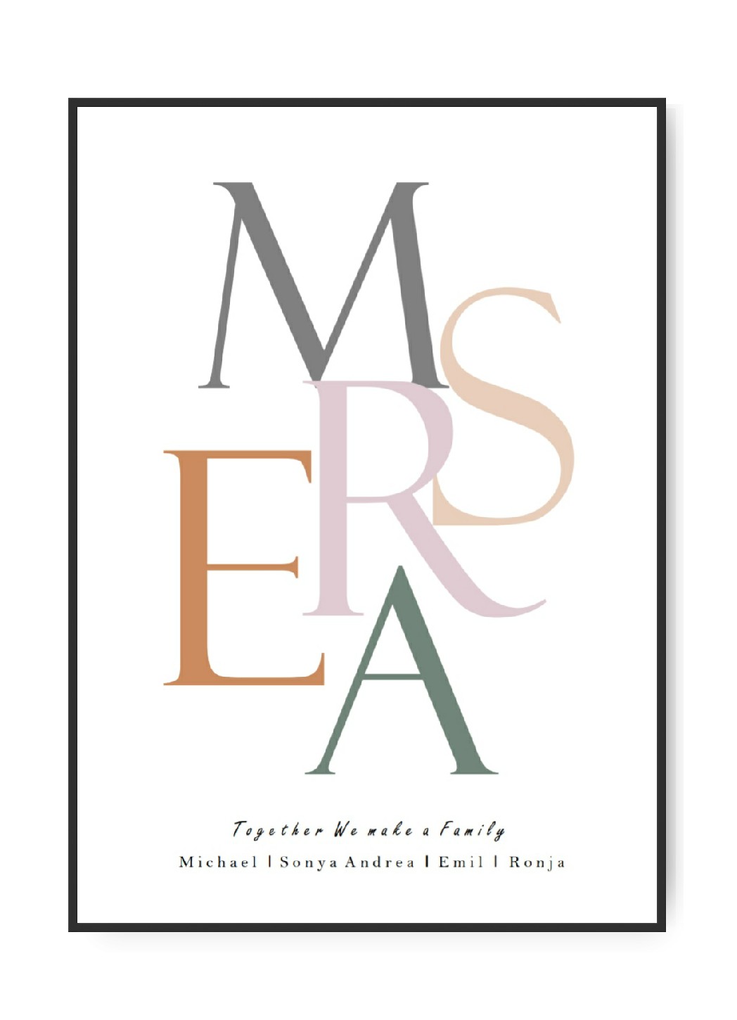 Familie Bundstav Poster, 5 frei wählbare bundstaver und Text 5 x frei wählbare bundstaver 5 x frei wählbare farver 1 x frei wählbar Text + Namen die Namen/bundstaverne/Text auf dem Bild ist nur ein Beispielempel Geben Sie die gewünschten Namen und Text i entsprechenden Felder Gedruckt auf 240 g/m² seidenmattem Kunstdruckpapier
