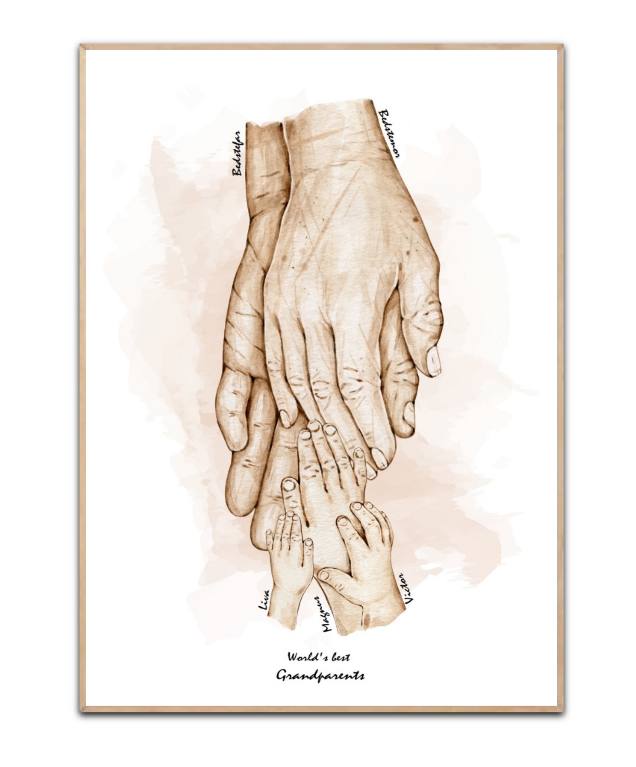 Großeltern Poster – Oma, Opa und 3 Enkelkinder, frei wählbare Namen Opa, Oma und 3 Enkelkinder 5 Frei wählbare Namen 1 x kort frei wählbar Text (kommt unten auf das Poster) die Namen auf dem Bild ist nur ein Beispielempel Geben Sie die gewünschten Namen und Farbe in die Felderet Gedruckt auf 240 g/m² seidenmattem Kunstdruckpapier Uden indramning